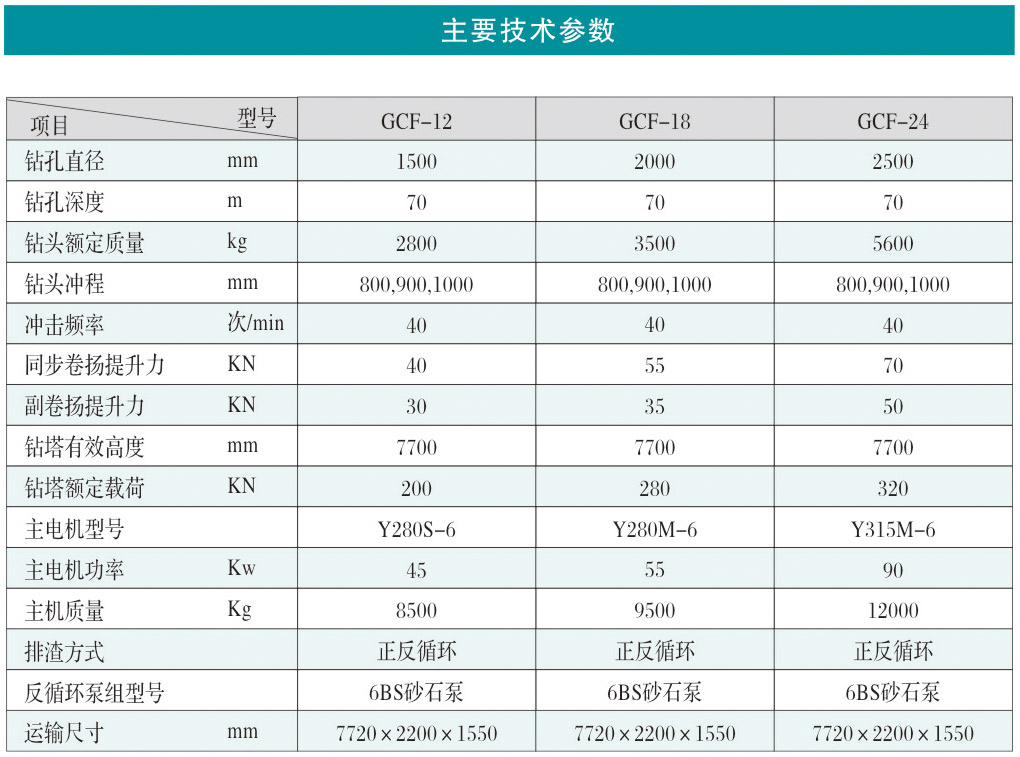 主要參數(shù)選擇合理、可滿足大口徑鉆孔的需要;純機(jī)械傳動(dòng)、結(jié)構(gòu)簡單、緊湊、布局合理、操作方便可靠;標(biāo)準(zhǔn)化、通用化程度高,維修方便;沖擊鉆頭質(zhì)量大,形成巨大沖擊功,產(chǎn)生良好的破巖效果;采用同步卷揚(yáng)機(jī)構(gòu),提拉鉆頭的兩根鋼絲繩能嚴(yán)格同步;采用壓梁沖擊實(shí)現(xiàn)鉆頭起落,工作穩(wěn)定可靠;可采用反循環(huán)工藝,排渣效率高。